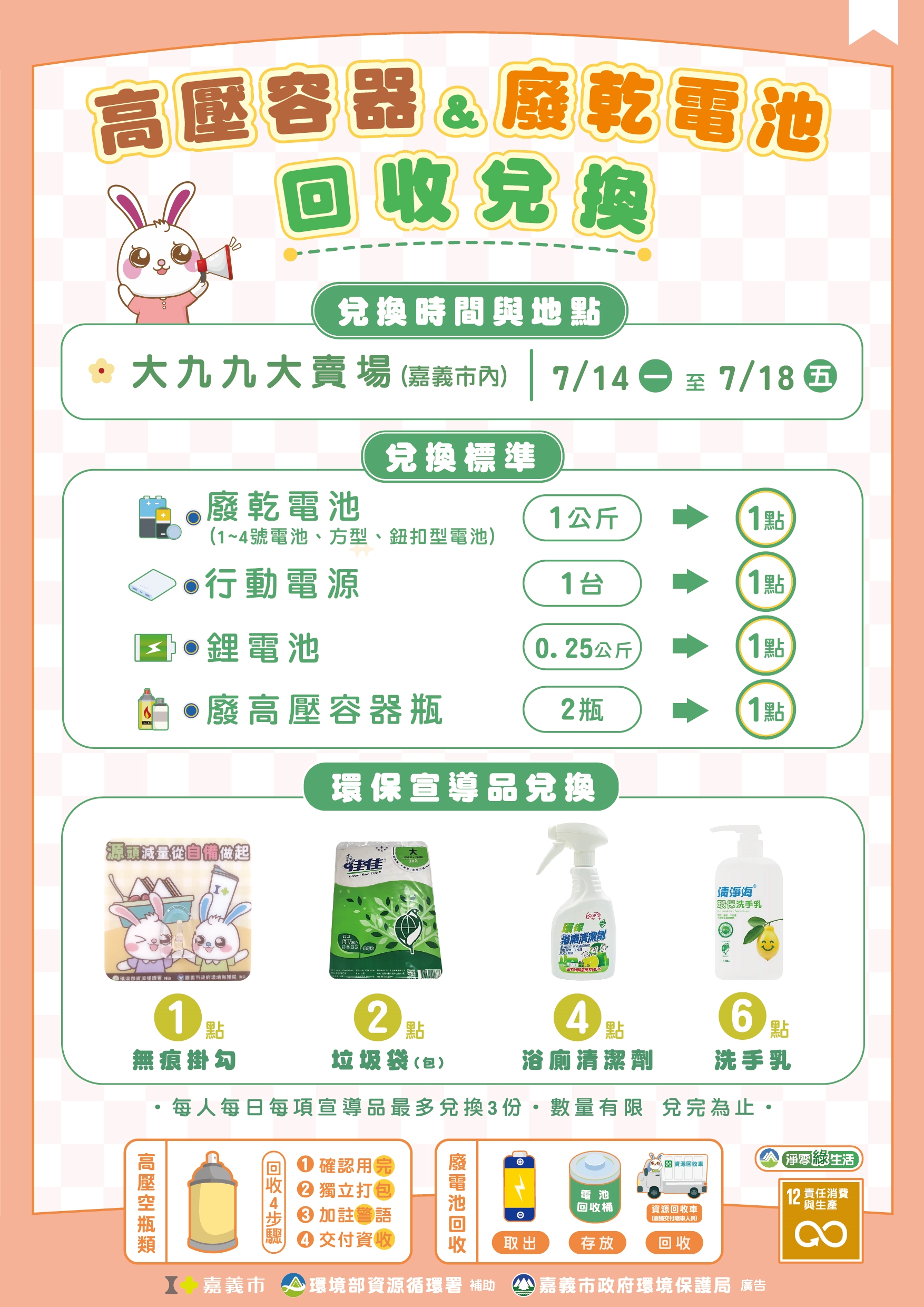 夏季高溫來襲,生活中經常使用的卡式瓦斯罐、防曬噴霧、殺蟲劑等高壓瓶罐,若瓶內仍殘留易燃氣體或有機溶劑,於回收處理過程中因擠壓、摩擦產生火花,極易引發事故,為提升回收安全與資源永續利用,嘉義市政府環境保護局於114年7月14日至7月18日,在嘉義市大九九賣場辦理第二波高壓容器及廢乾電池回收兌換活動,只要攜帶指定回收物至活動地點,即可兌換宣導品。