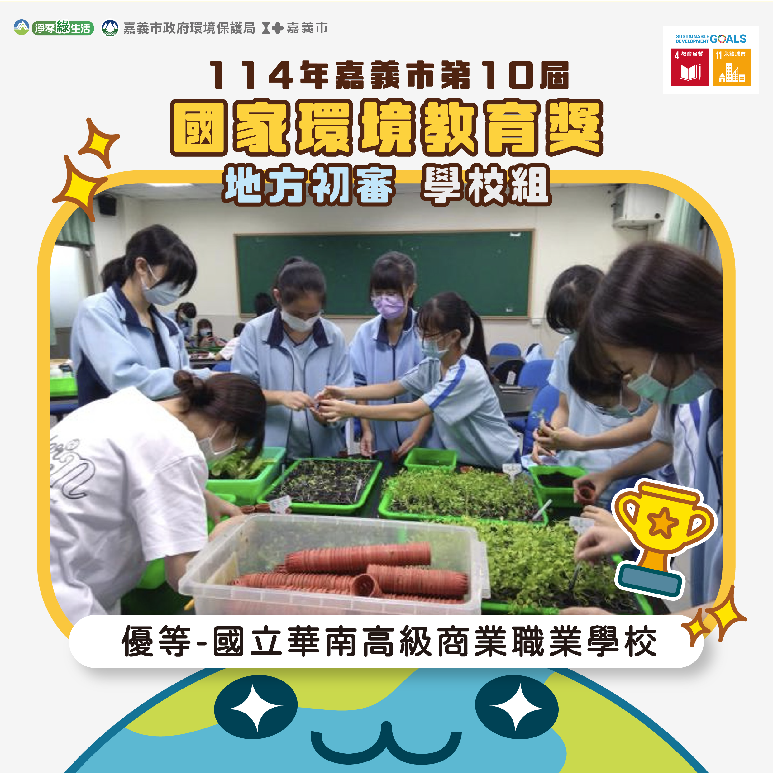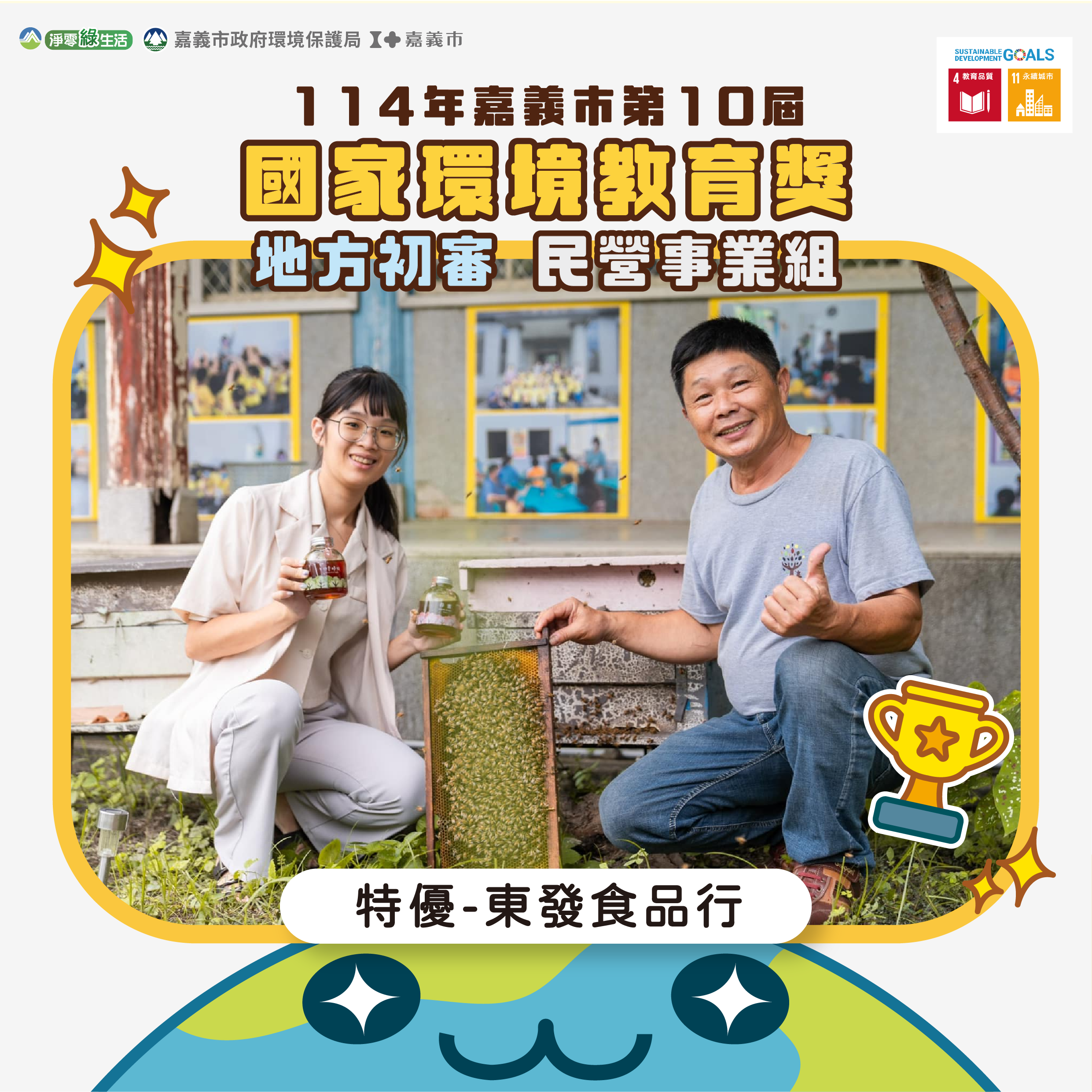 民營事業組特優「東發食品行」以人蜂共好、共享自然為理念,打造四季蜂收園區,園區結合生態養蜂、植物多樣性與食農教育,落實推動友善農法與低碳經營,成為推動生態保育與環境永續的重要示範基地。學校組特優「嘉義市立玉山國民中學」以校本課程玉見名山為核心,結合道將圳走讀、魚菜共生與落葉堆肥行動,讓學生從課室走向土地,學習珍惜守護環境並落實永續行動;優等「嘉義市宣信國民小學」地處南田市場周邊,透過藝文空間及繪本傳承歷史文資及培養永續素養,讓環境及土地成為最生動的教室。優等「國立華南高級商業職業學校」以跨域課程結合理論與實作,打造兼具知識與實踐的學習場域,讓學生在探究與實驗中培養環保意識與創新能力。