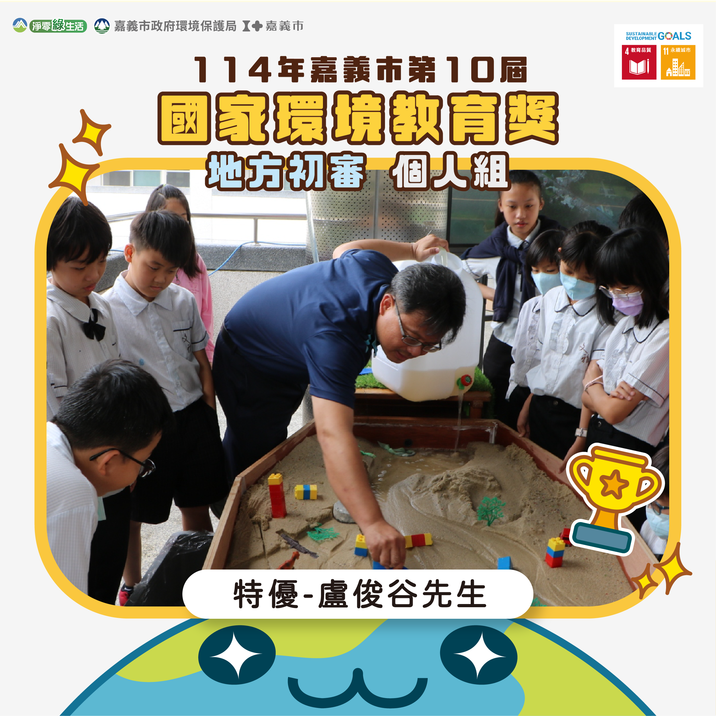 社區組特優「嘉義市西區何庄社區發展協會」活化老屋阿雲柑仔店為環教推廣核心據點,結合青銀共創力量,推動低碳生活與防災意識,展現在地社區韌性與環境共好力量;優等「嘉義市東區興仁社區發展協會」以農園共學作為核心,帶領居民走入自然了解社區生態資源,打造實驗型社區農園,讓居民親手種植共同維護,從耕作中重新理解人與土地的關係,讓環境教育深植生活。個人組特優得主盧俊谷先生以防災與氣候調適為核心,研發動態河流演示台與沉浸式演習法,將抽象理論化為具體行動,培力上百社區與學校轉化為主動防災實踐者,是在地推動永續的典範;優等得主陳青秀女士長年投入學校與社區環境教育志工服務,以自身所學與知識感染周邊人群重視環境珍惜資源,並策劃運用低碳運具打造漫遊我嘉課程,踏查古蹟古道生態環境,透過共遊共學寓教於樂成效卓著。