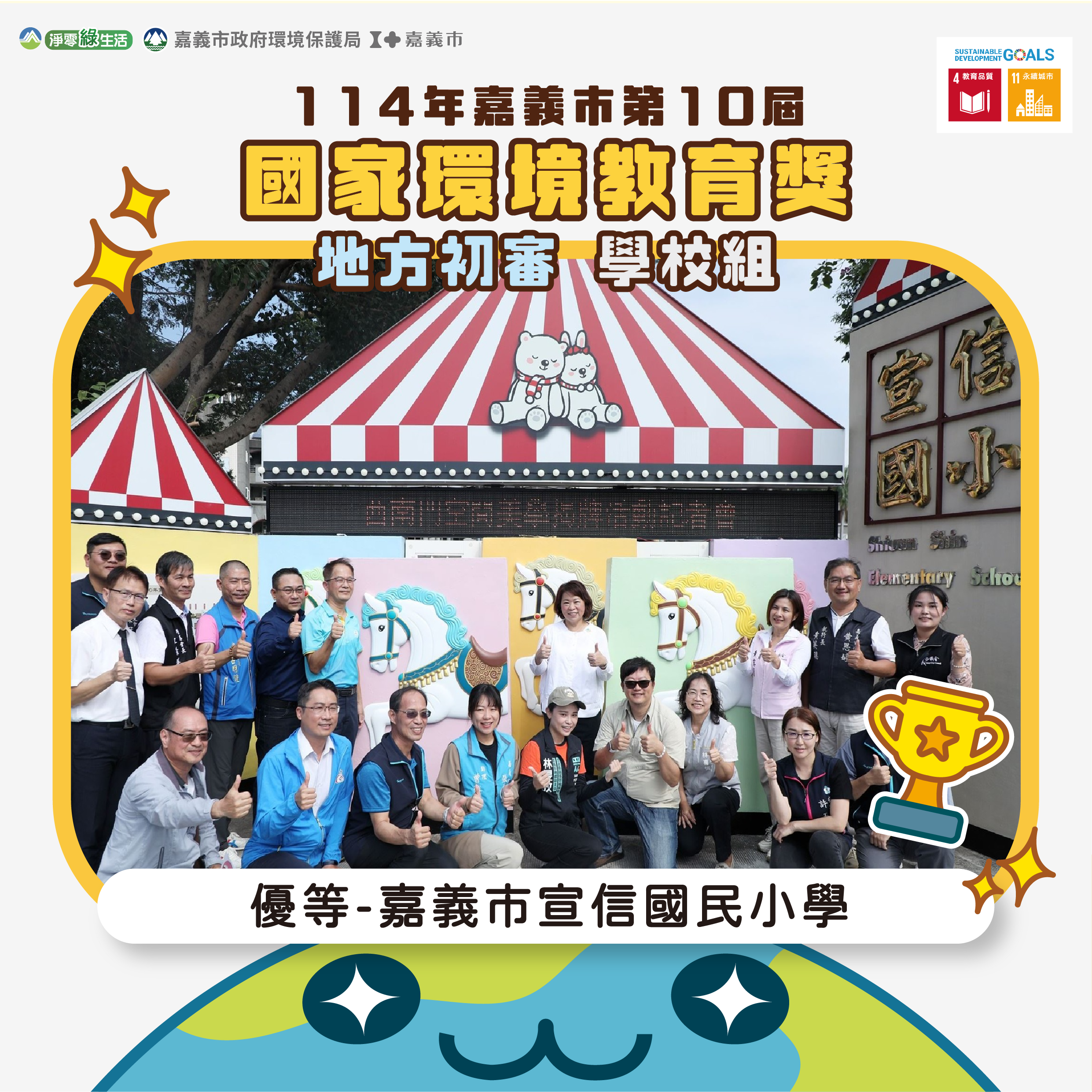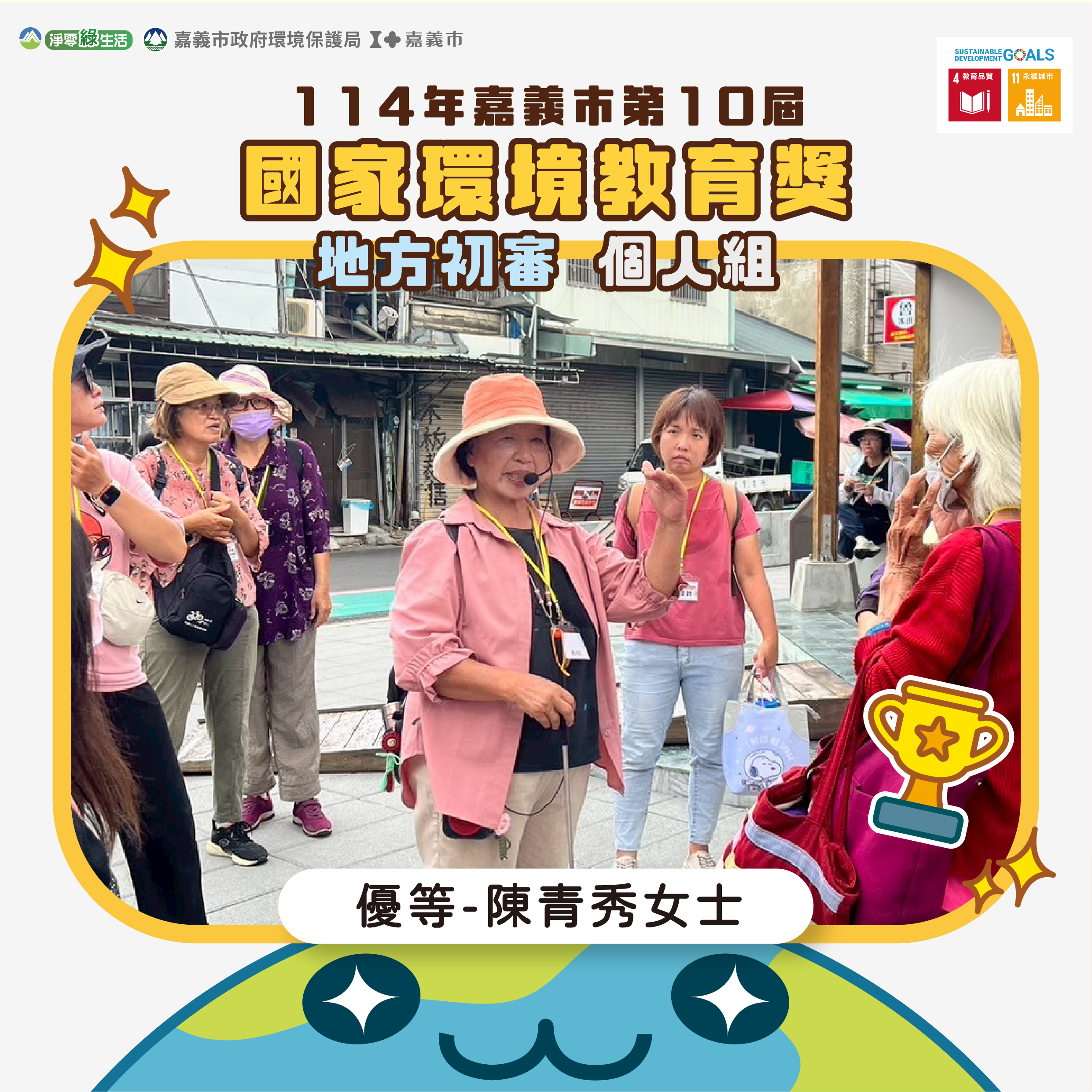嘉義市政府環境保護局辦理第10屆國家環境教育獎地方初審結果出爐!經過評審委員實地訪查及綜合評選,榮獲特優者將代表嘉義市參加全國複審,角逐最高榮譽。感謝各獲獎者長期致力環境教育推廣,透過各單位的努力及扎根,期喚起更多人環保意識將永續融入生活。此屆嘉義市共有民營事業組、學校組、社區組及個人組等8個單位脫穎而出。