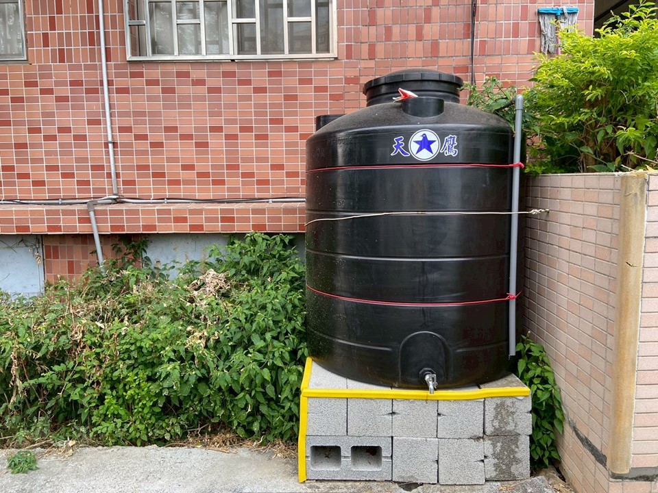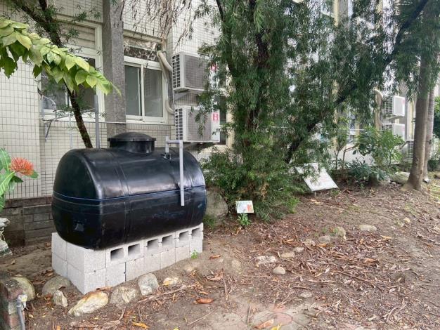 林森國小建置6座儲水槽,蒐集圖書館二樓頂層雨水,作為校園菜園及植栽澆灌用水,每年約可回收雨水33,600公升,年減碳量約5.04公斤二氧化碳排放當量(CO₂e)。