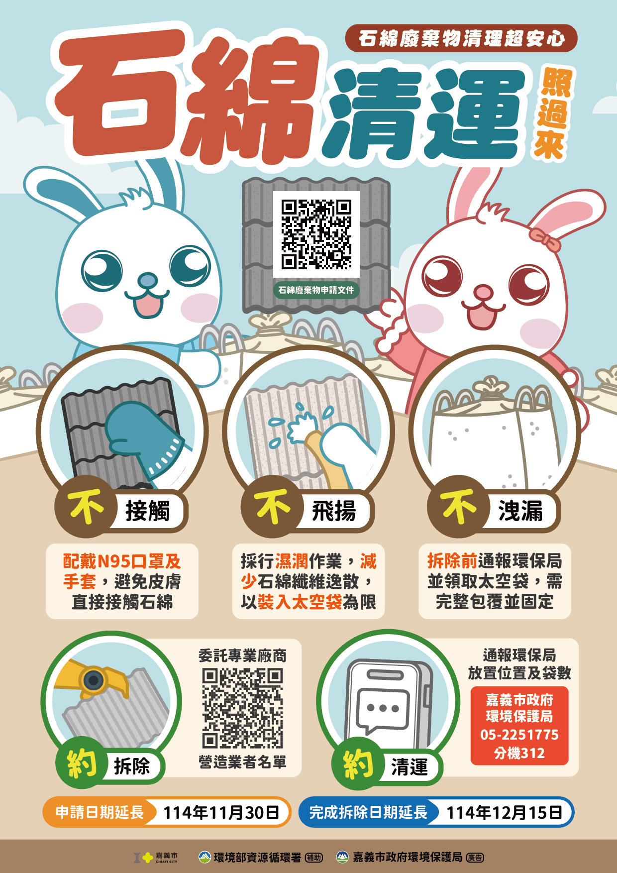嘉義市政府環境保護局蕭令宜局長表示,將持續加強石綿管理及宣導,協助市民辨識潛在風險,一起打造乾淨、安全、無石綿的家園,共同營造健康安心的居住環境。若有石綿相關問題,可撥打環保局石綿諮詢專線(05)2251775轉312(吳小姐)洽詢。