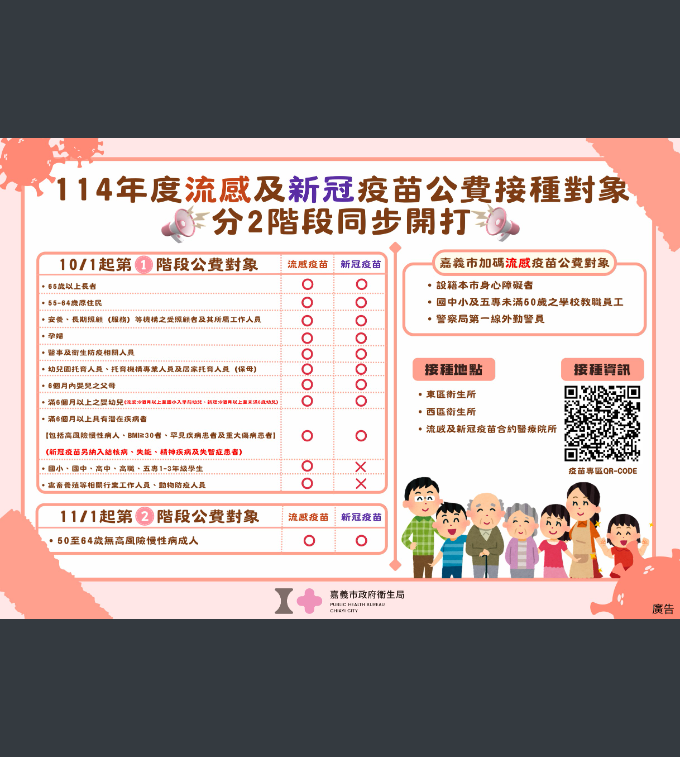 接種流感及COVID-19疫苗可降低重症發生風險,併同接種有助於提升接種率,衛生福利部疾病管制署參考美國CDC對於流感與COVID-19疫苗同時接種安全性評估,本(114)年10月1日起流感與COVID-19疫苗同步分兩階段開打。