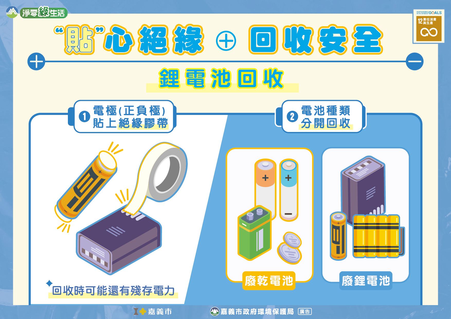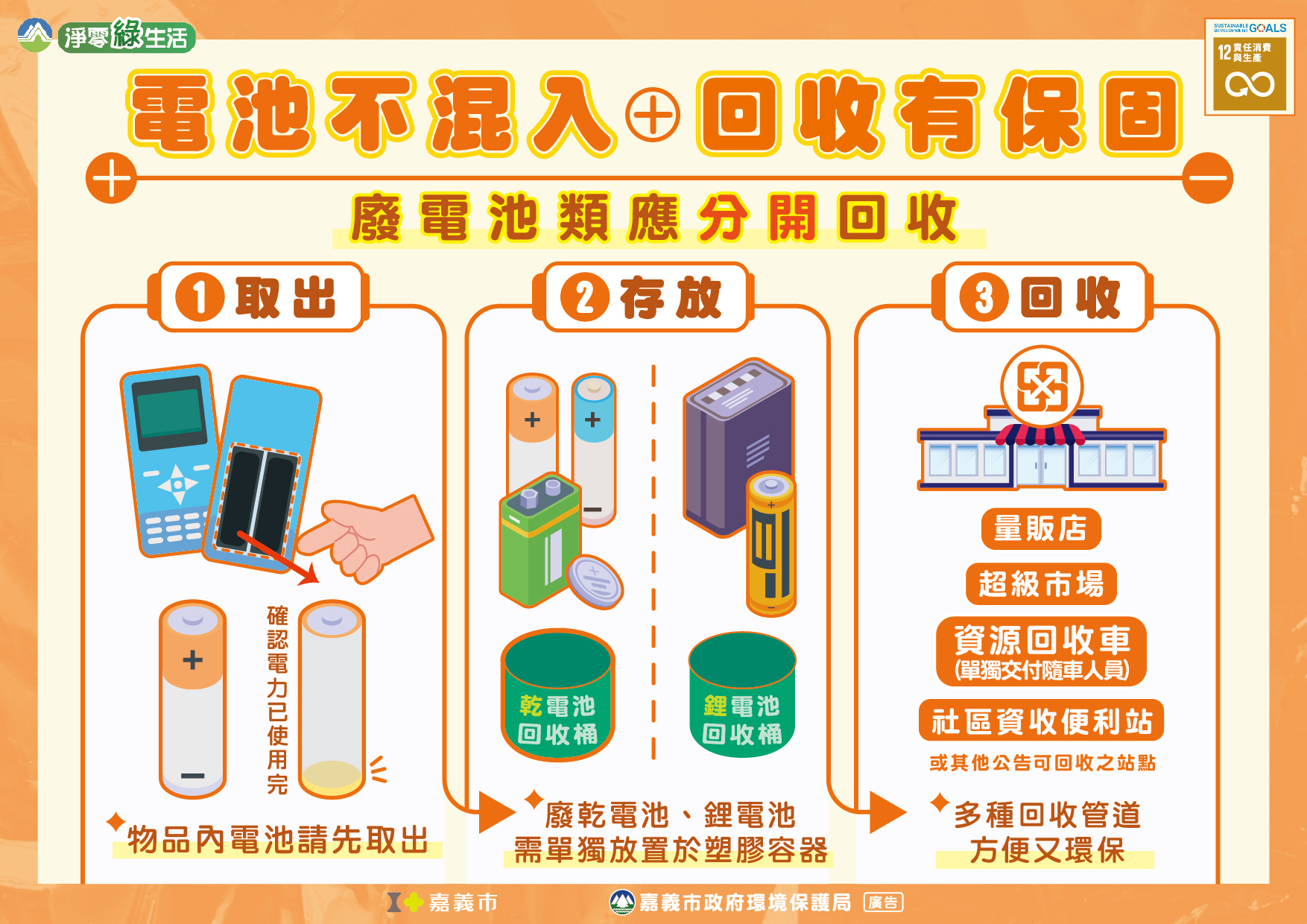 為避免資源回收過程中因不當貯存方式引發火災風險,嘉義市政府環境保護局提醒市民朋友,廢電池請務必單獨分類回收,不可與一般垃圾或其他資源物混合丟棄。記住「取出、存放、回收」三步驟,就能降低風險守護環境。