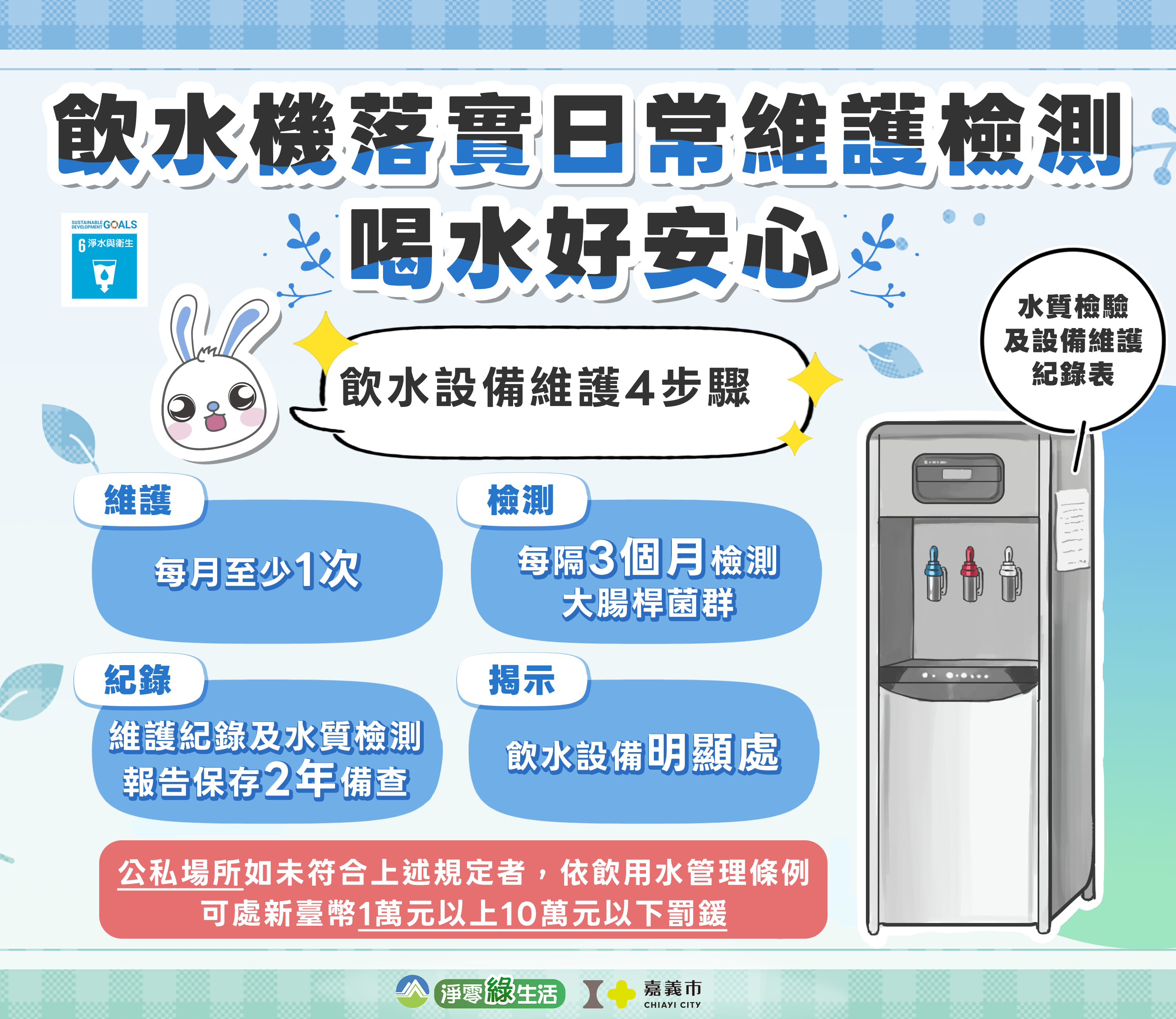 嘉義市政府環境保護局提醒,公私場所如未依規定進行飲用水設備維護、檢測、紀錄、揭示,依飲用水管理條例可處新臺幣1萬元以上10萬元以下罰鍰,呼籲公私場所設置飲水機後,就要落實日常維護檢測,才能確保水質,保障民眾用水健康。